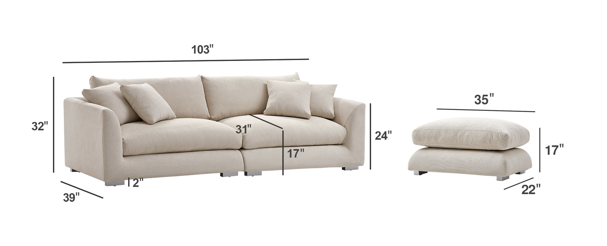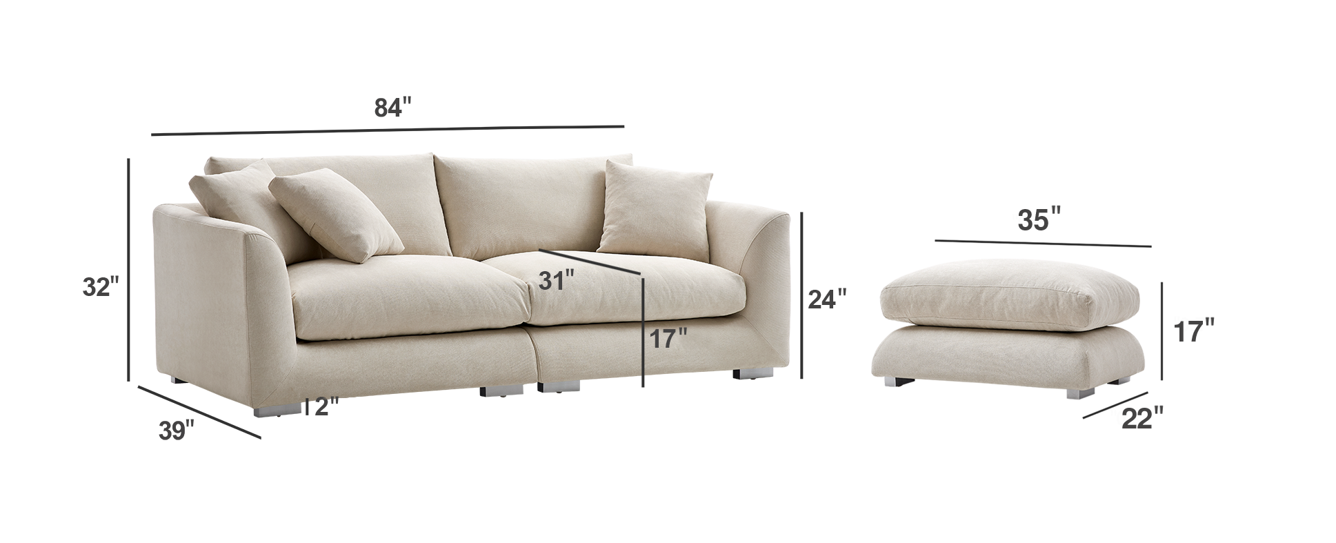The body of the sofa has been meticulously crafter with a frame constructed from durable Pine Wood. The legs are carved from Ashwood and finished with metallic paint for a dash of modern flair. The seating is constructed using an ideal mix of filling materials, featuring 25% polyurethane foam pad, 3% polyester fiber, 29% polyester fiber batting, and a substantial 43% duck feathers, culminating in supreme comfort without compromising structural integrity.