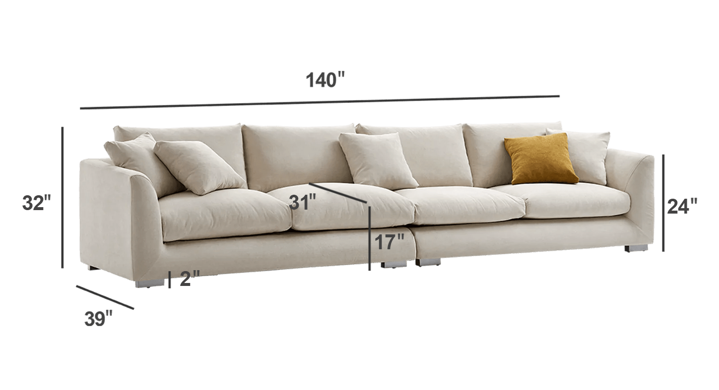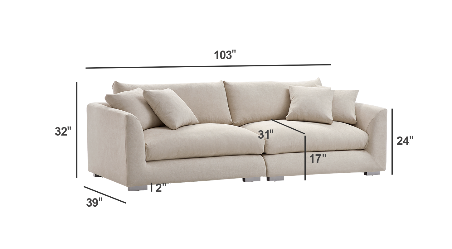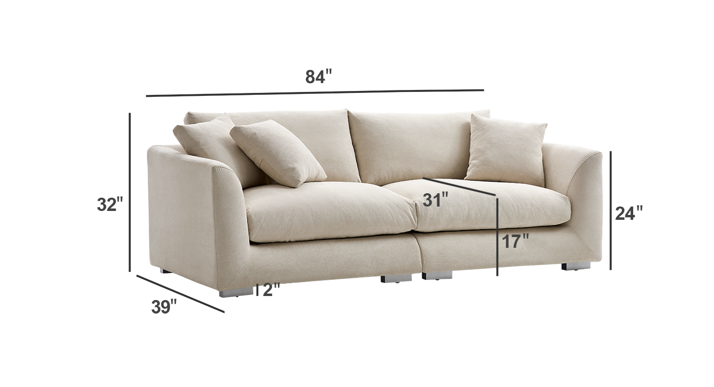 The body of the sofa has been meticulously crafter with a frame constructed from durable Pine Wood. The legs are carved from Ashwood and finished with metallic paint for a dash of modern flair. The seating is constructed using an ideal mix of filling materials, featuring 25% polyurethane foam pad, 3% polyester fiber, 29% polyester fiber batting, and a substantial 43% duck feathers, culminating in supreme comfort without compromising structural integrity.