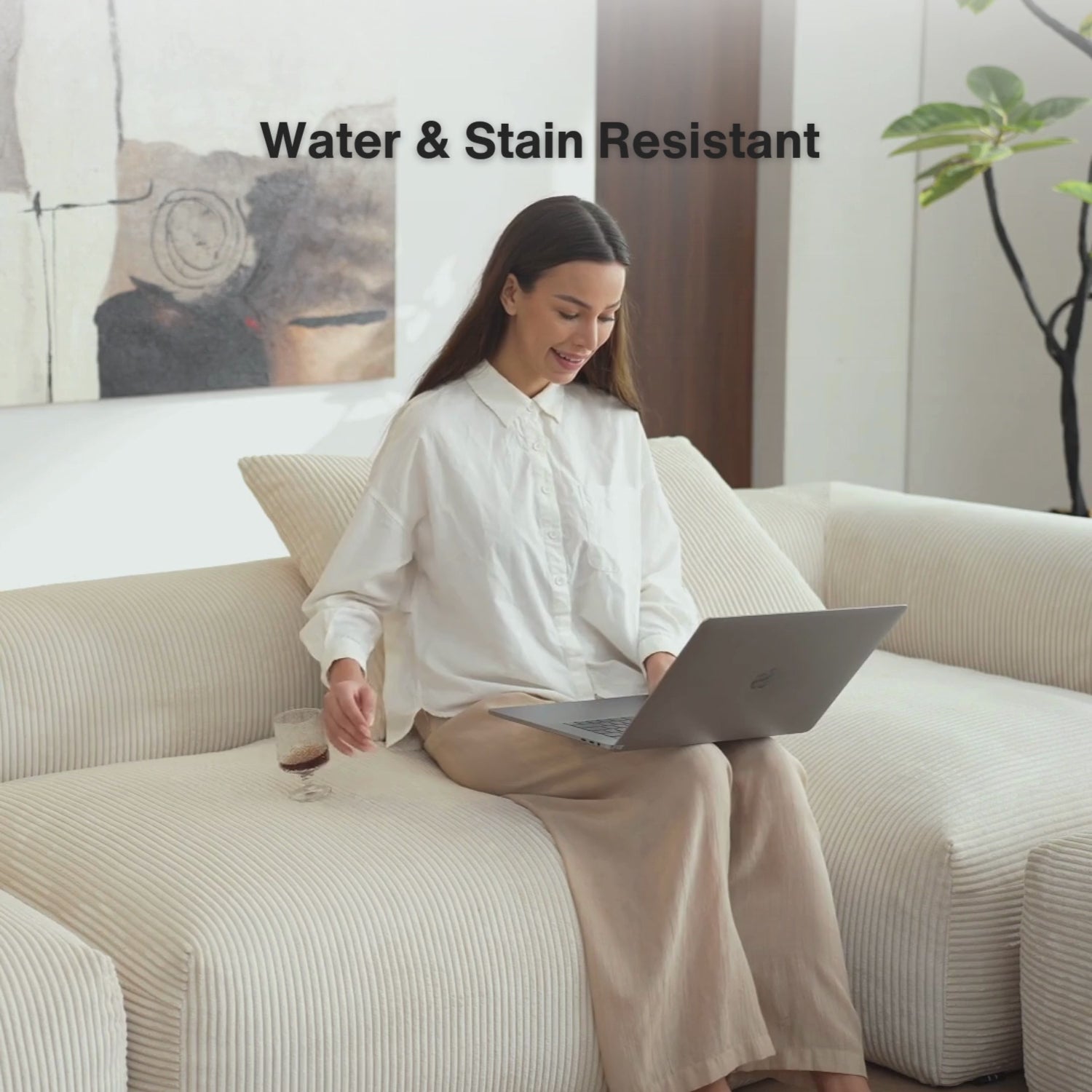 The sofa is free from hard frames or wire springs and is made from layers of cotton cushion, feathers, memory foam, latex foam, and high-resilience foam, all covered in plush corduroy to ensure you never compromise on comfort.